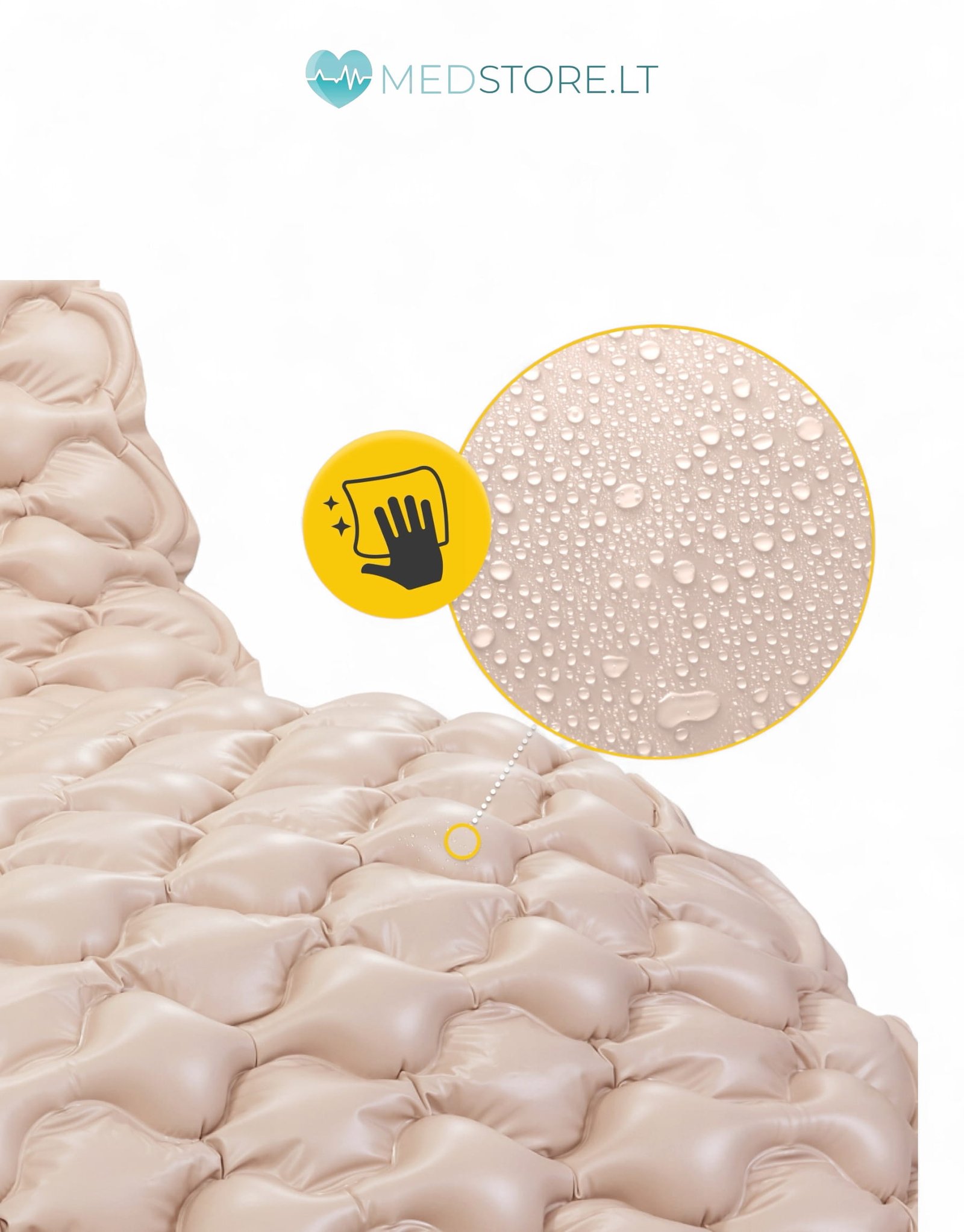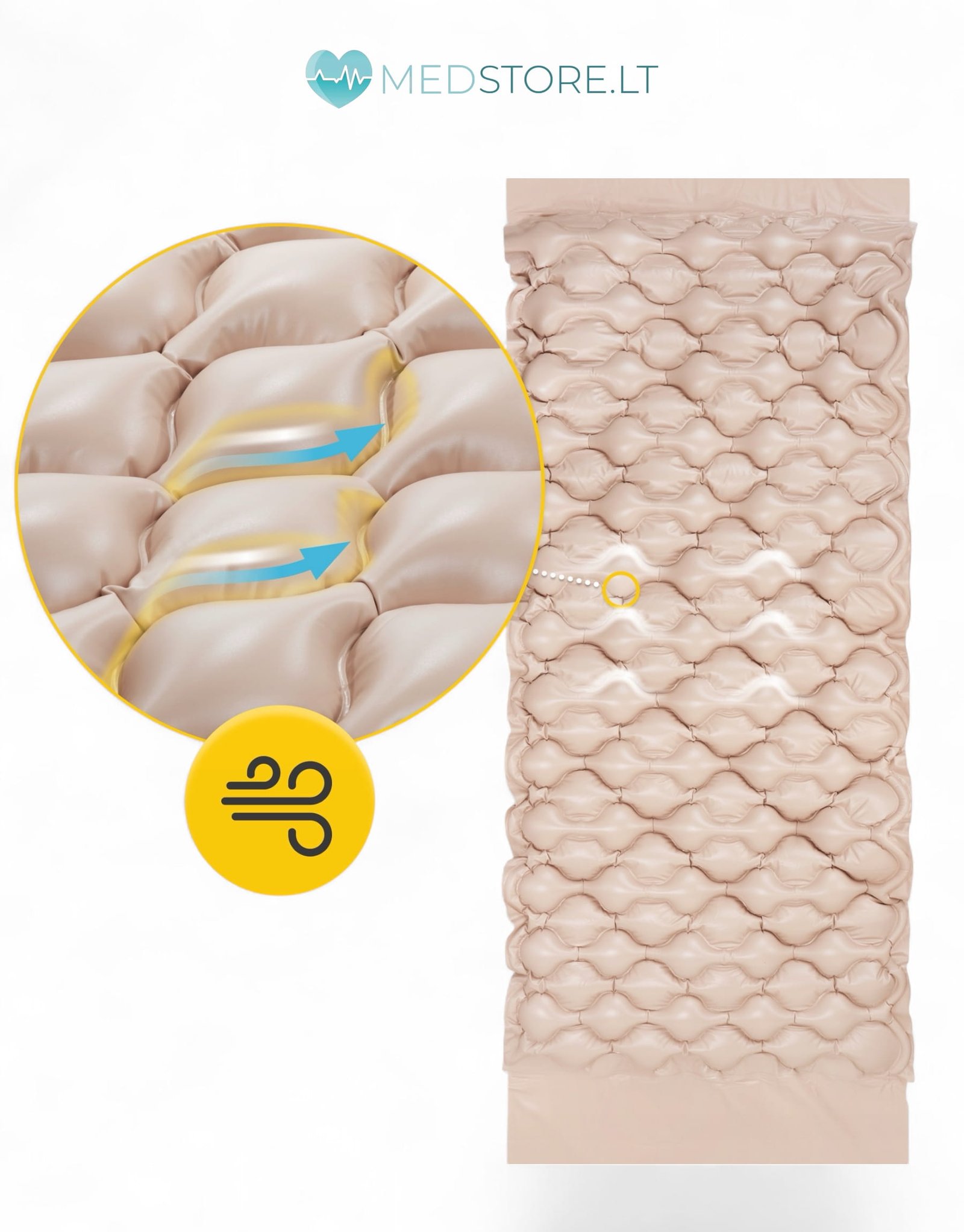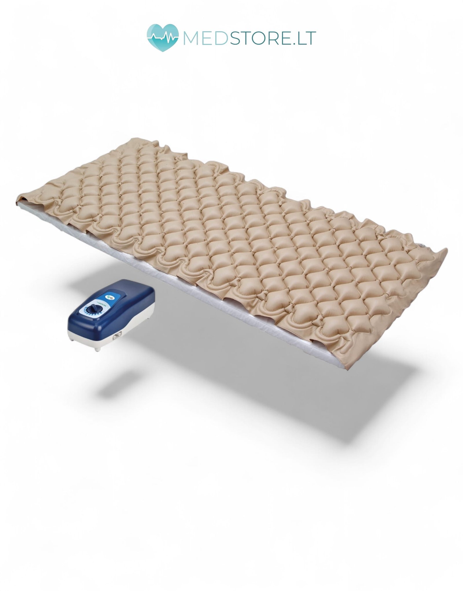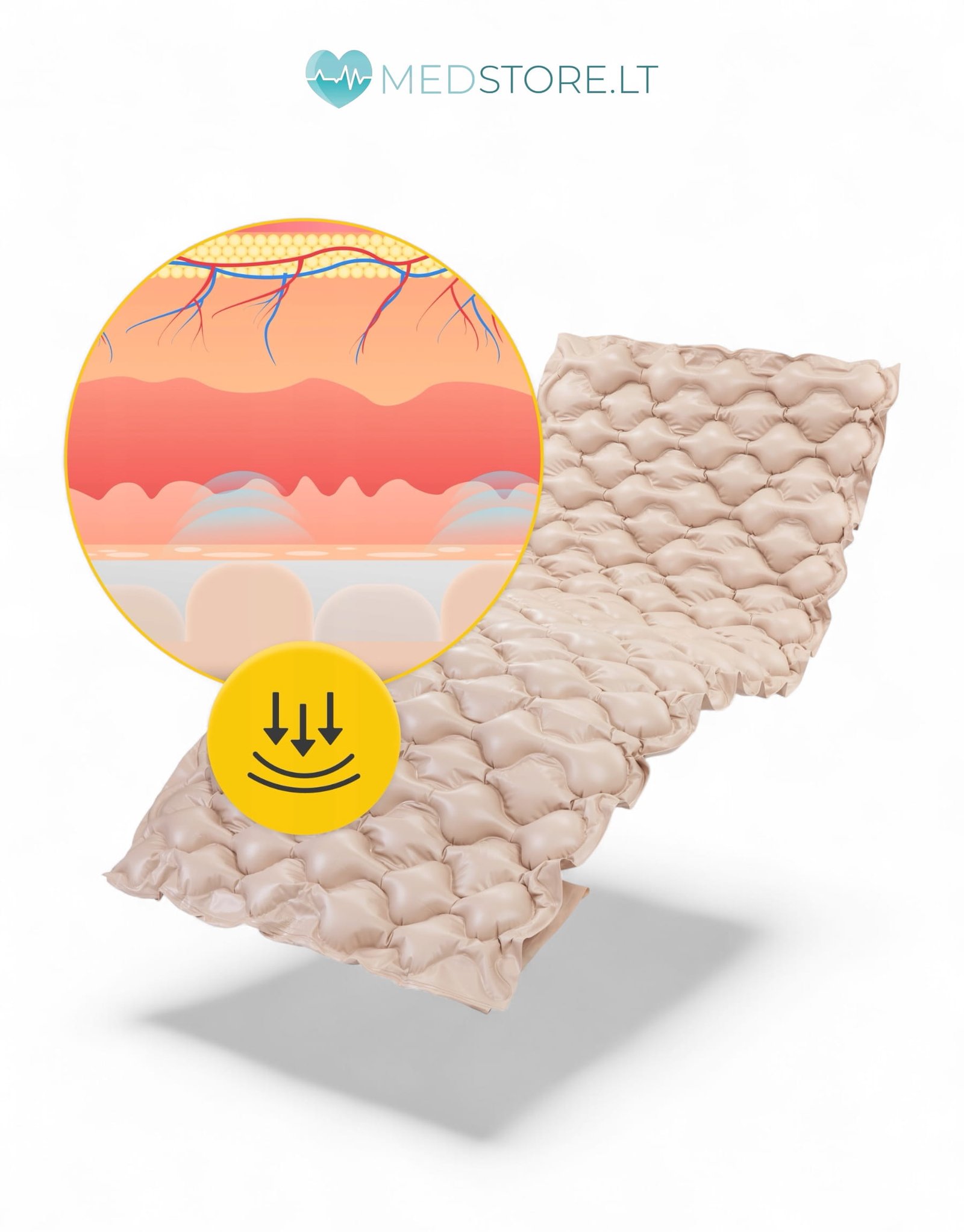 Čiužinys nuo pragulų su kompresoriumi – efektyvus sprendimas pragulų prevencijai. Oro cirkuliacija mažina spaudimą ir gerina kraujotaką, užtikrindama komfortą gulintiems pacientams.