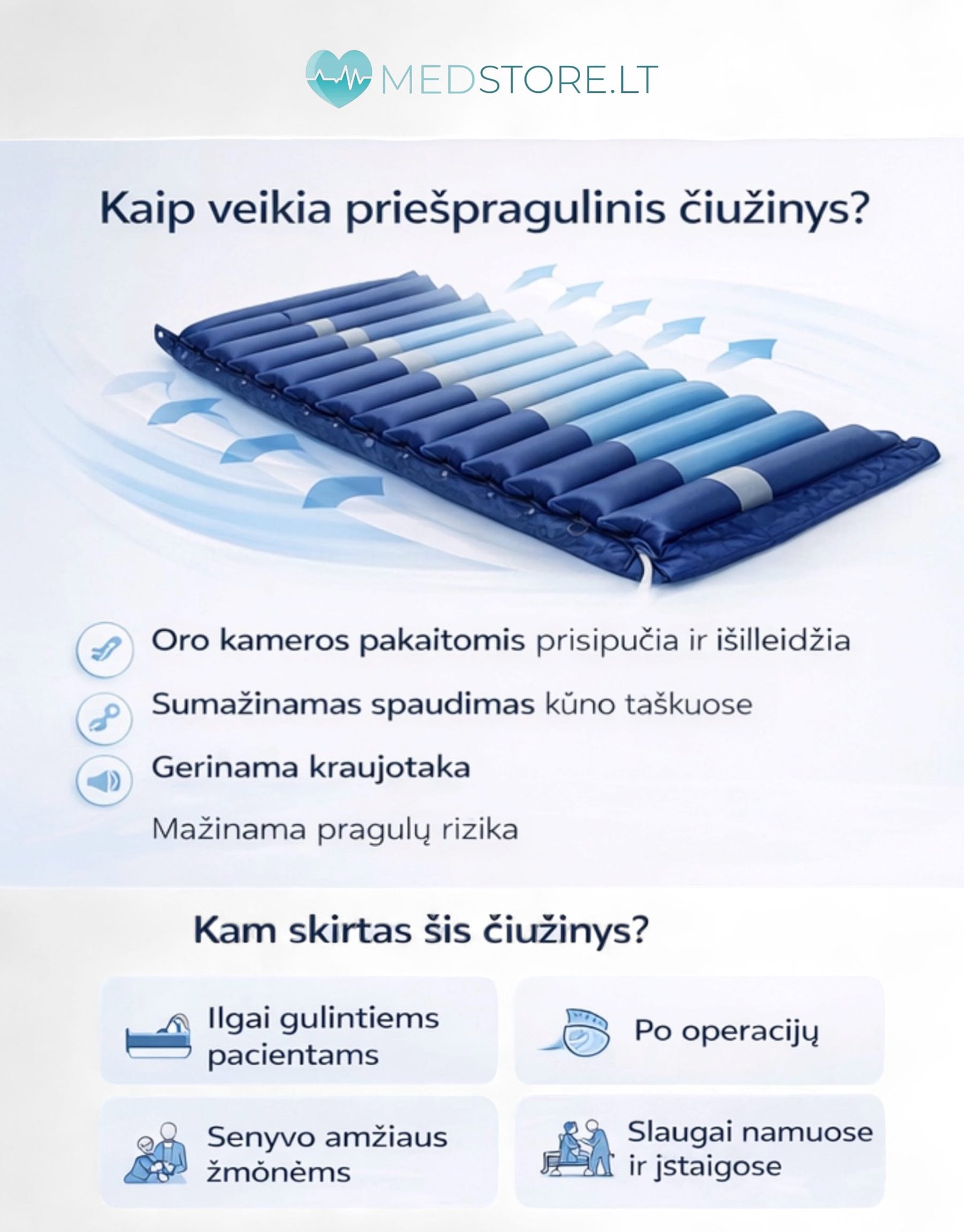 Čiužinys nuo pragulų tiesiamas ant pagrindinio čiužinio ir prijungiamas prie kompresoriaus, kuris automatiškai reguliuoja oro slėgį.
