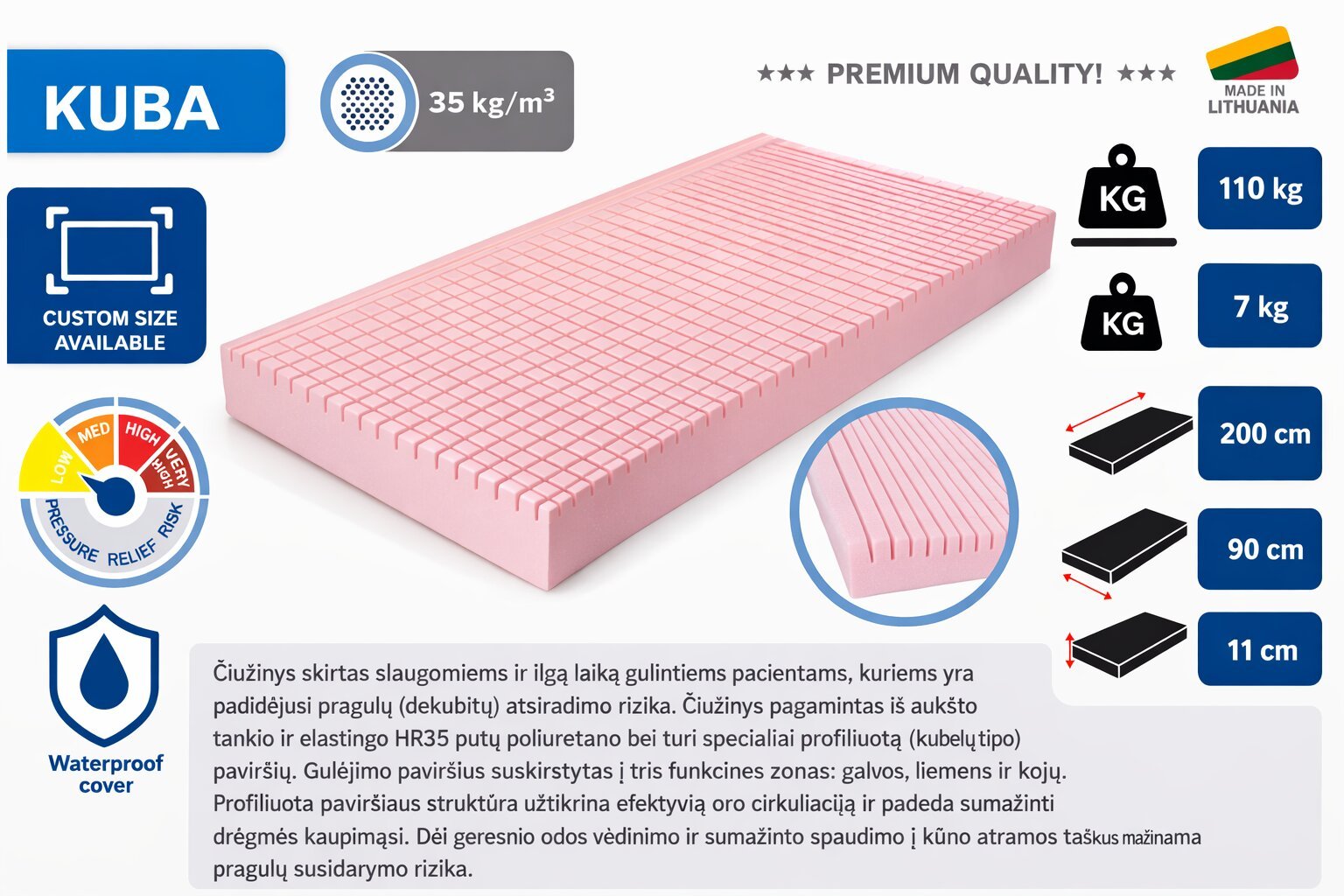Kokybiškas ir patogus čiužinys KUBA pagamintas iš didelio tankio bei elastingumo porolono (HR35) ir skirtas žmonėms, turintiems pragulų riziką. Jis iškarpytas „kubeliais“, suskirstytas į galvos, kojų ir liemens sekcijas. Čiužinio išpjovos užtikrina laisvą oro cirkuliaciją, todėl tarp gulinčiojo odos ir gulimojo paviršiaus nesikaupia drėgmė bei mažiau spaudžiami minkštieji kūno audiniai.